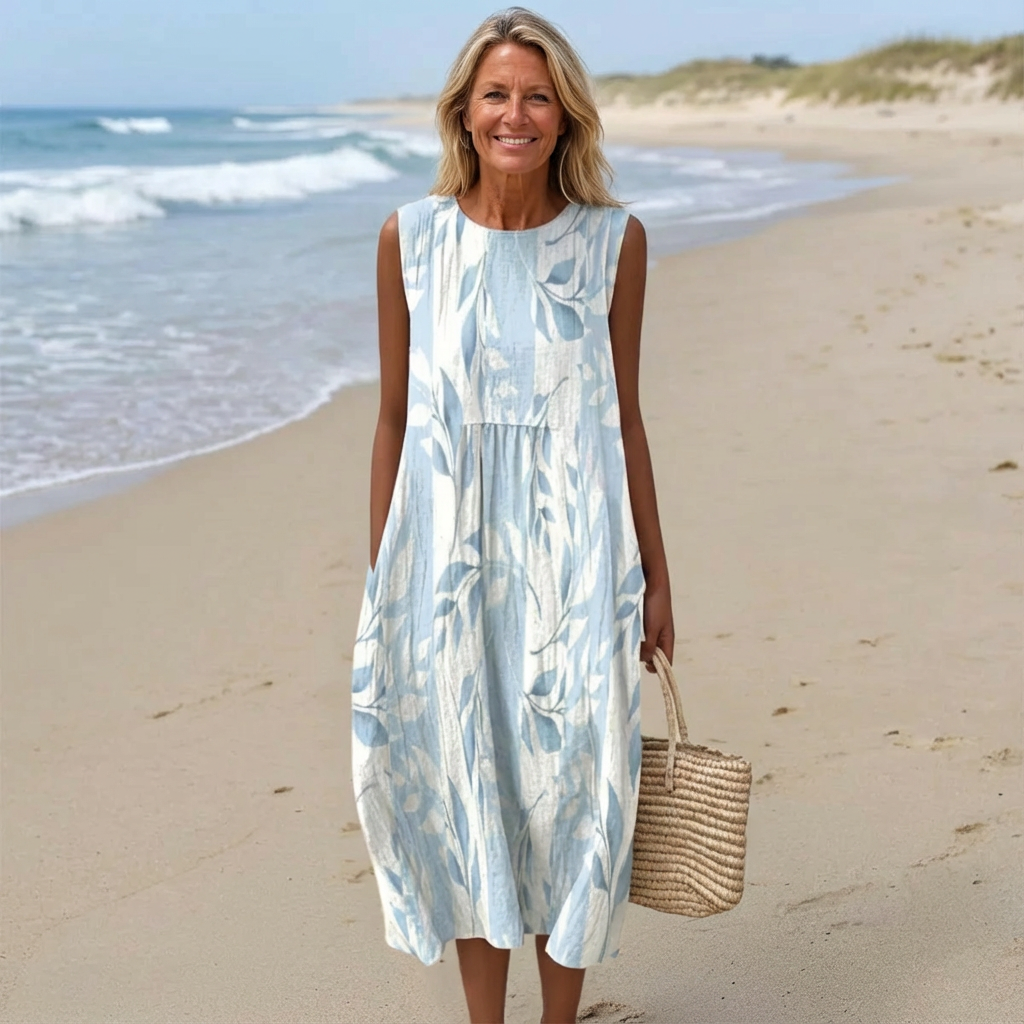 The Joy Leafy Midi Dress offers a relaxed, flowing fit that gently skims the body for a flattering silhouette. Soft blue-and-white leafy patterns add a calm, refreshing touch, making it perfect for casual outings, lunch with friends, or relaxed evenings.