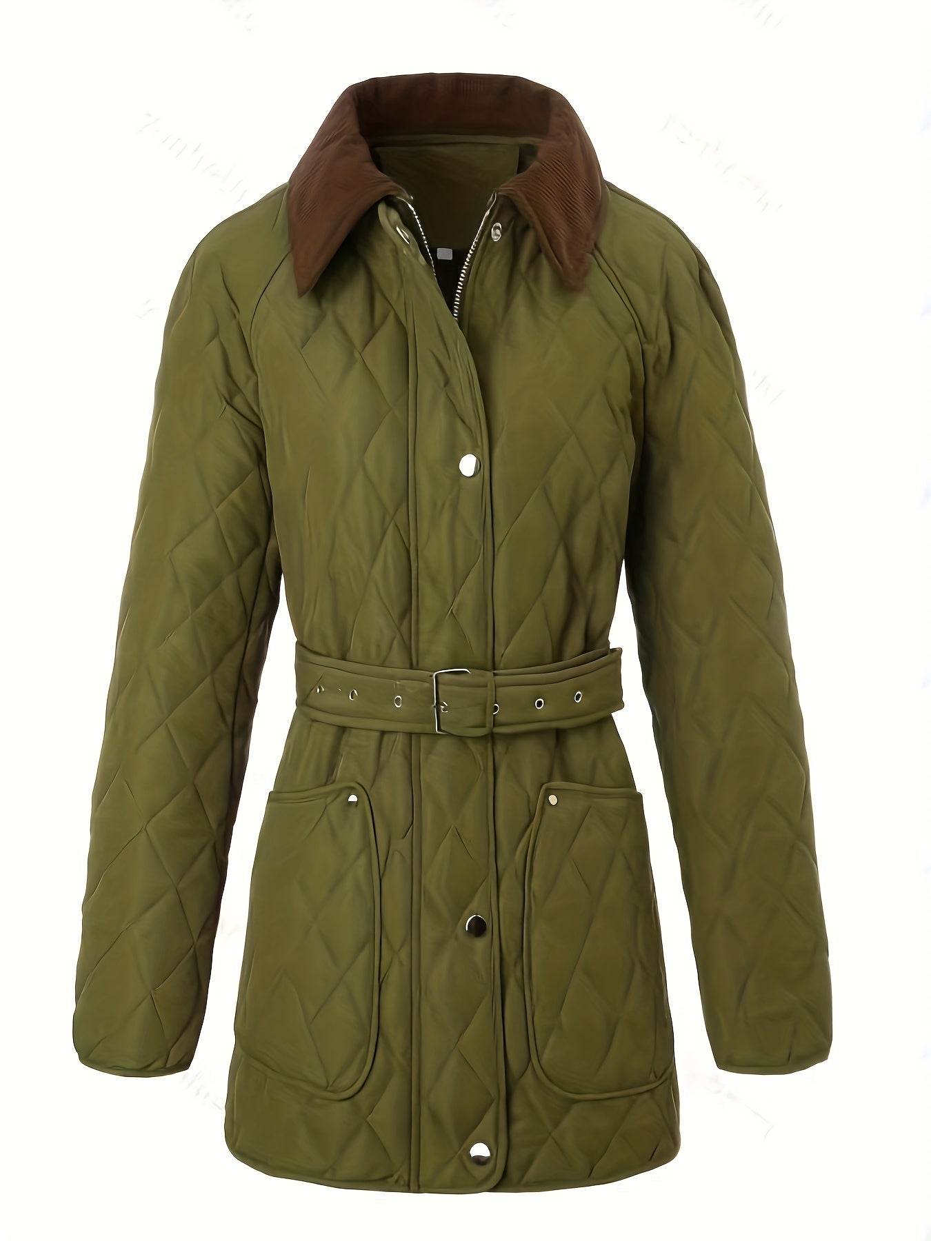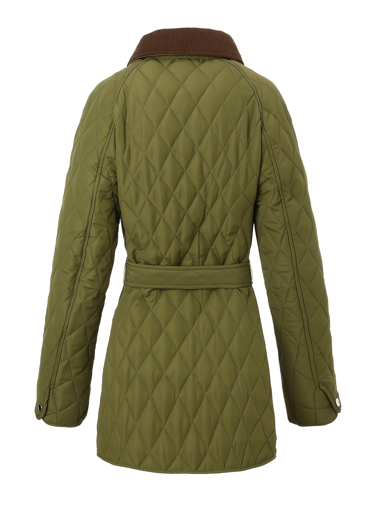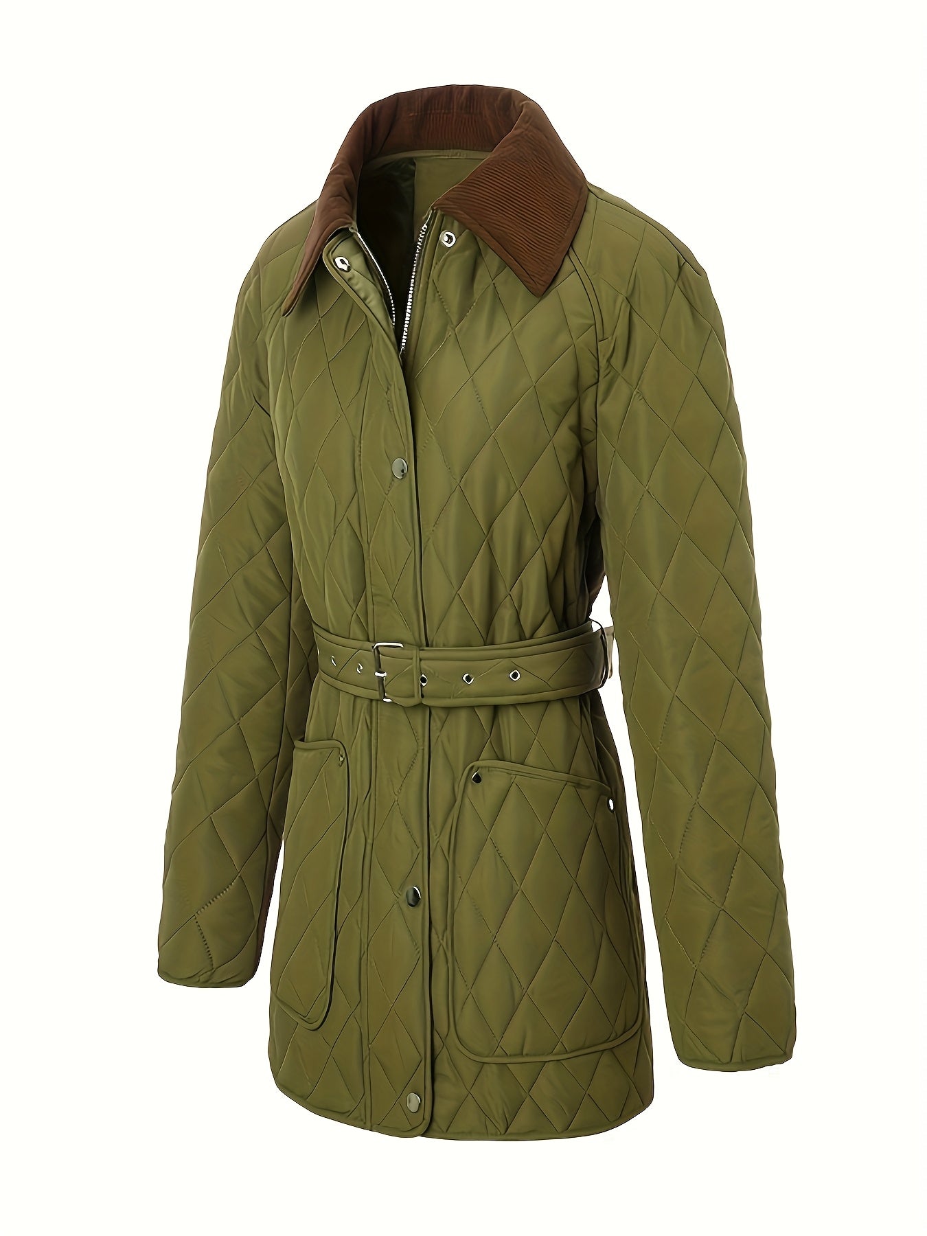 The Avery Olive Green Quilted Jacket with Belt blends timeless style with everyday practicality. Its quilted pattern creates a flattering silhouette, while the adjustable waist belt adds definition and elegance. Featuring a soft contrast collar and spacious front pockets, this jacket offers a classic countryside-inspired look—perfect for autumn, winter, and cool spring days.